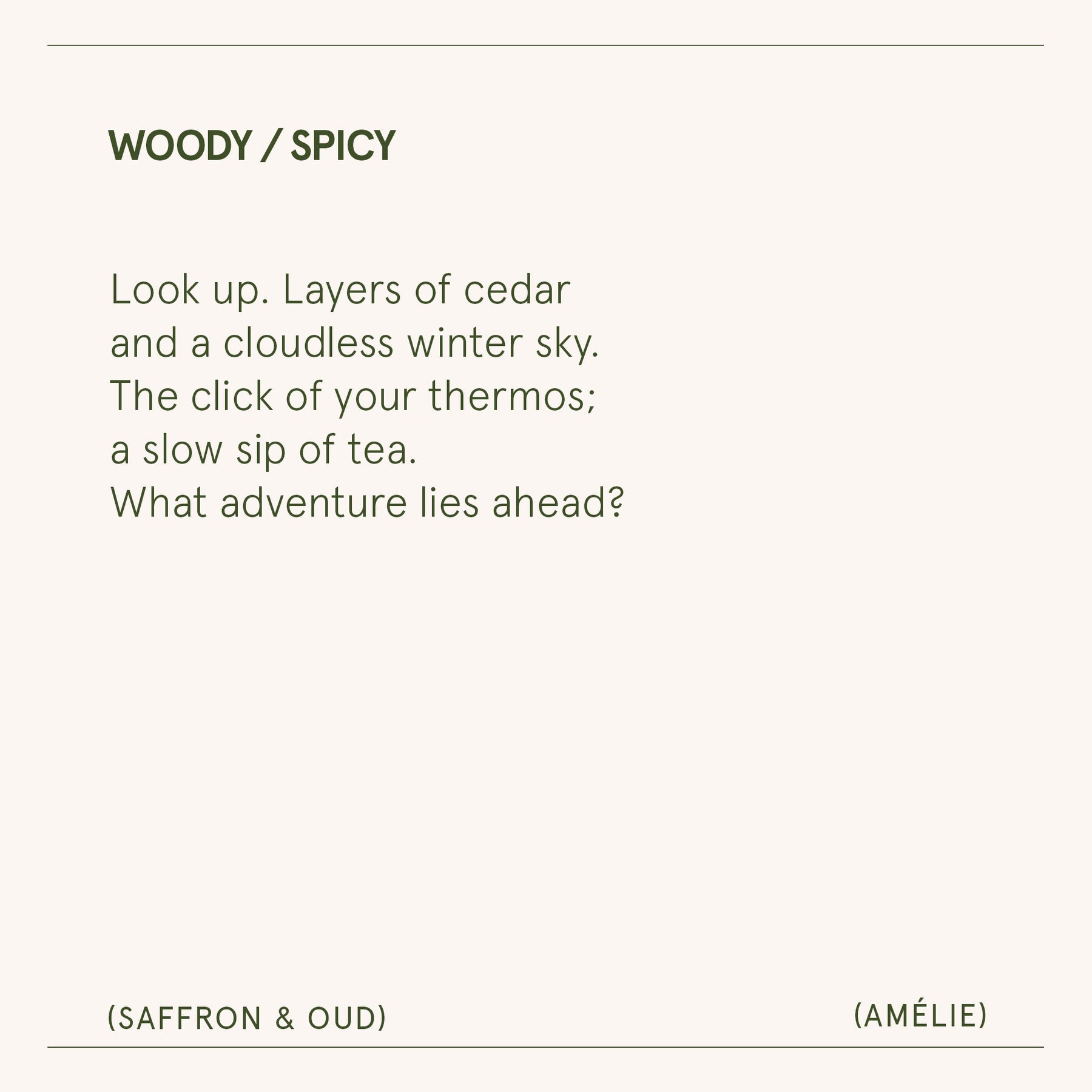 Top: Incense | Middle: Oud, Red Saffron | Base: Patchouli, Fresh Cedar, Vetiver.