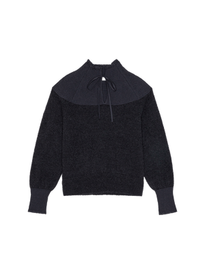 One piece you’ll never want to take off—the Babette Sweater, a luxe layering essential made of brushed Caraveli alpaca in a relaxed pullover fit. A funnel neck, bishop sleeves, smocked cuffs, and a contrast-woven yoke add soft volume and gentle warmth. These details do it all.