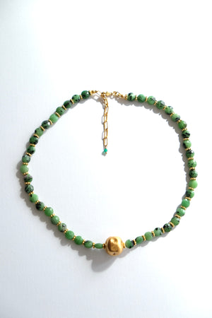 Enjoy the natural beauty of this new necklace from Clara Forno Ikigai. Beautiful beads of ruby zoistie shine against gold plated beaded spacers. The showstopping centerpiece is a round gold bead with indents for a natural and rustic feel.