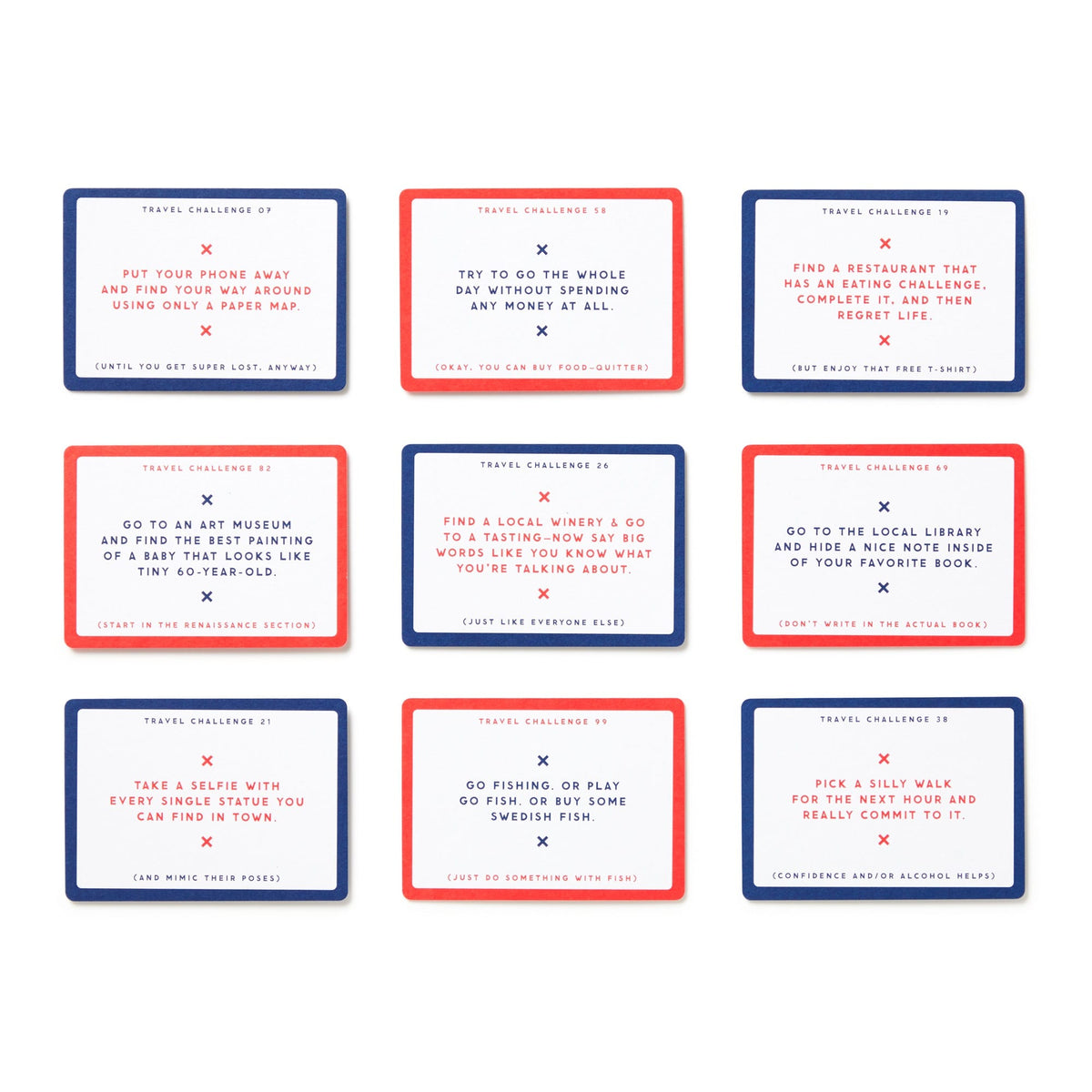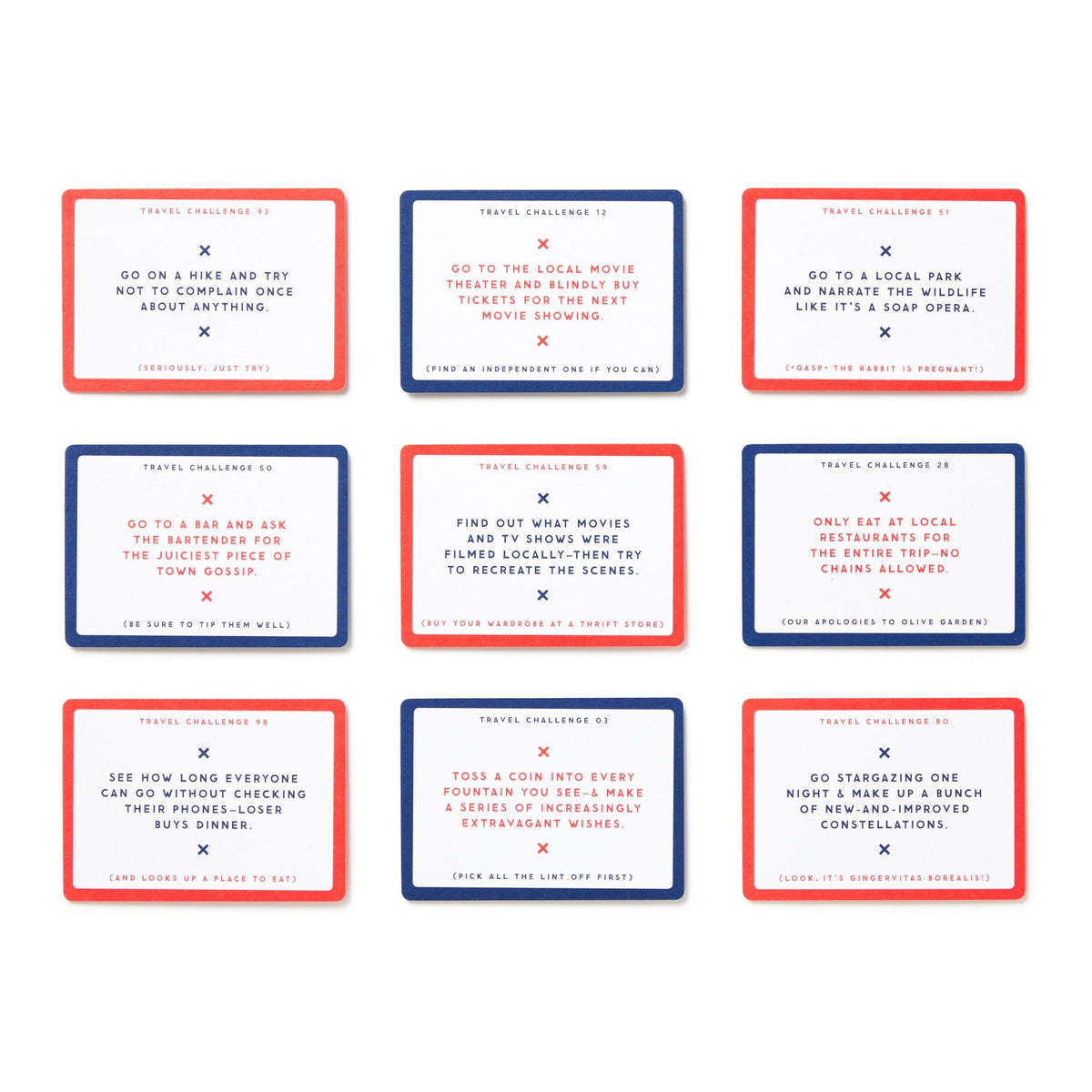 Traveling is supposed to be fun–but most of the time, the last thing we have time to do is come up with fun and spontaneous things to do on our actual vacation other than google ‘things to do in (insert city here)’. Get off the beaten path and use this portable card deck of travel challenges to force yourself out of your comfort zone. Just draw a card at random, and complete the task while on your trip. There’s even a spot on the back of each card to ‘journal’ a few words about the experience. 100 double-sided cards–each featuring a unique challenge on the front and a place to record the experience on the back.