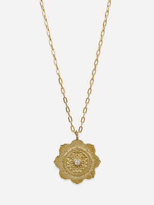 The Chakra Pendant embodies the profound symbolism of the 8-petaled lotus, representing purity, enlightenment, and spiritual rebirth. Each petal signifies harmony and balance, guiding you on a journey towards spiritual alignment. Set with a white diamond and hanging elegantly from a gold-filled chain, this pendant serves as a reminder of the strength of new beginnings and the interconnectedness of all things. Let it inspire your path to inner peace and enlightenment.