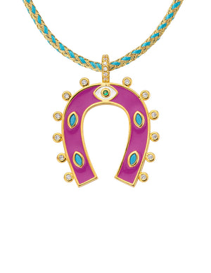 The FUCHSIA HORSESHOE necklace by MYA—BAY is gilded with 24-carat recycled fine gold . Mounted on a flashy cord, its large horseshoe-shaped pendant symbolizes luck, success, and that little something extra that makes all the difference. At 52 cm long , it can be worn long to brighten up a silhouette. The fuchsia electrifies this jewel like a pop nod to the Wild West.