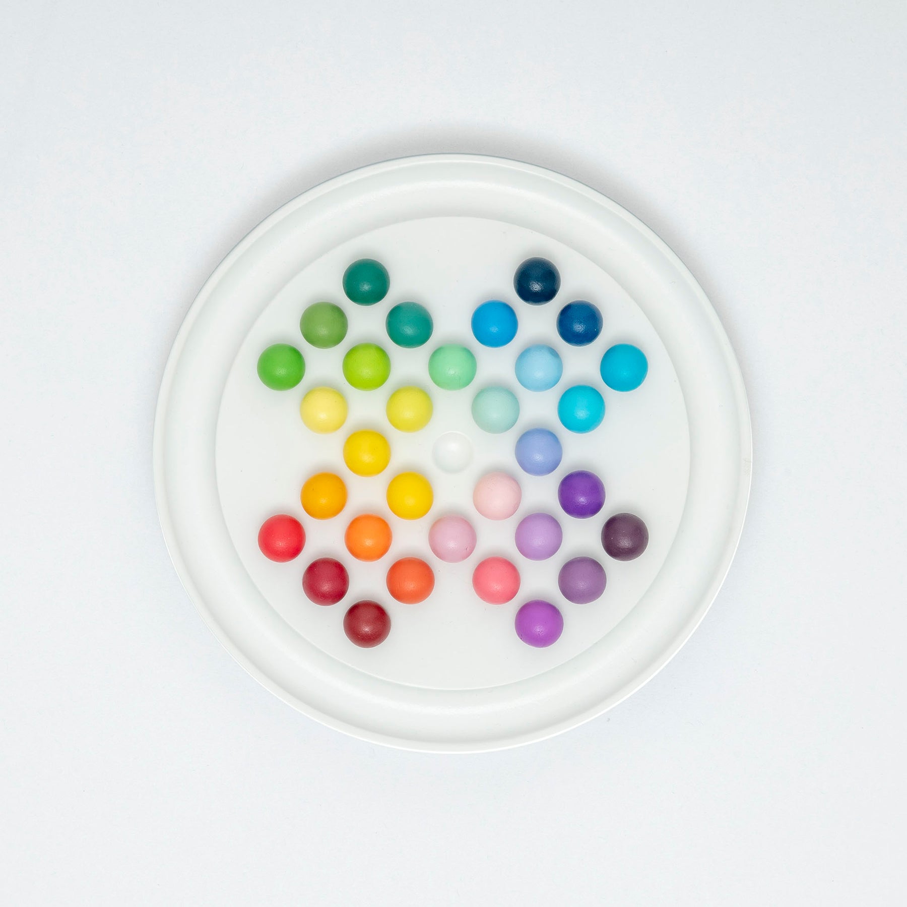 These beautiful wooden solitaire balls are painted in a palette of 33 selected from the colour wheel. You can use a color wheel formation as a starting point for your game of solitaire, or you can make the palette your own before you start your game.