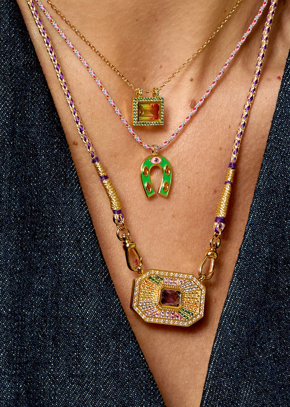 The GREEN MINI HORSESHOE necklace by MYA—BAY is gilded with 24-carat recycled fine gold . Its small horseshoe-shaped pendant is colored with a bright green enamel—a symbol of luck, success, and positive energy. Mounted on a cord, it measures 39 cm + 5 cm of extra chain for an adjustable and lightweight fit.