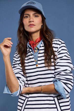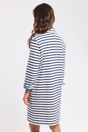 This iconic workwear garment from Amor Lux is reimagined here as a more feminine striped dress. Perfect for Spring with its sailor style and buttoned slit collar. Featuring 3/4 sleeves, two front pockets and side slits.