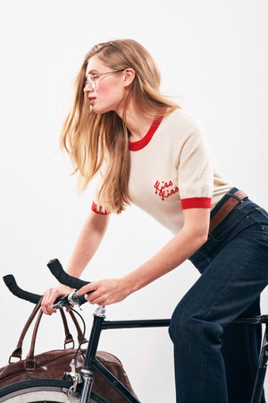 This cashmere short sleeve ringer has a vintage vibe with its cursive "Kiss Kiss" embroidery and contrasting red ribbed sleeve and crew neck. Pair it with a dark denim or a high waisted trouser.