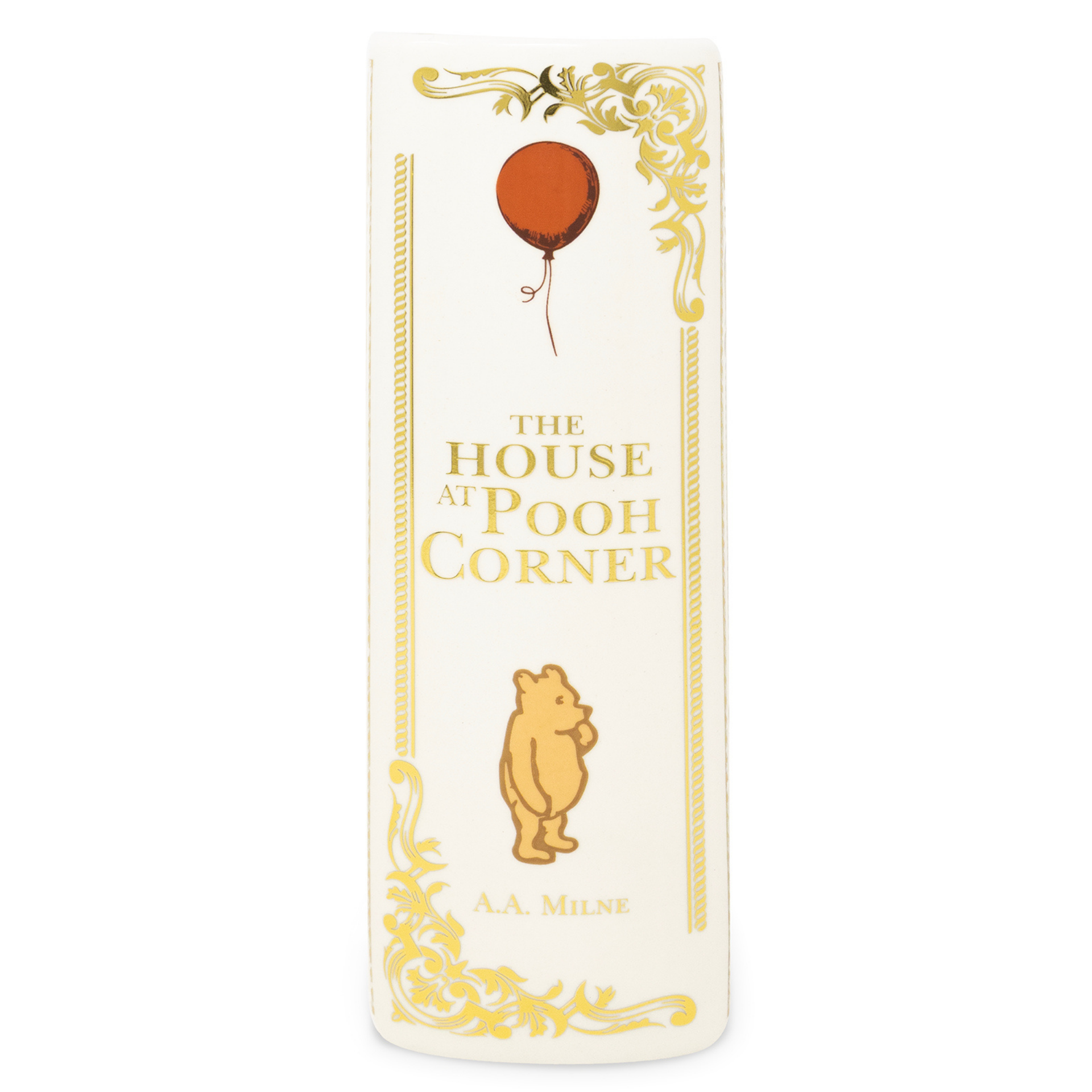 Our large ceramic book vase is the perfect piece for any book lover's space. Designed to mimic a hardcover book, the vase features sculpted pages, with a wide top opening for flowers, desk supplies, utensils, and more. The cover features art inspired by A.A. Milne's beloved novel The House at Pooh Corner to adorn your space with classical and bookish charm.