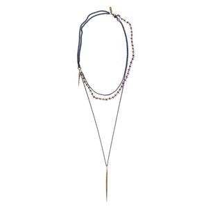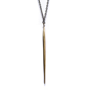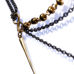 Layered brass African rosary and blackened brass chain with small hand cast brass smooth spike charm and small hand cast brass quill.
