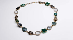 Stunning worn alone, and dramatic when stacked, this new necklace from Paula Rosen dresses up your look for any occasion! Enjoy a stunning array of greens and natural tones in a mixture of gleaming gemstones.