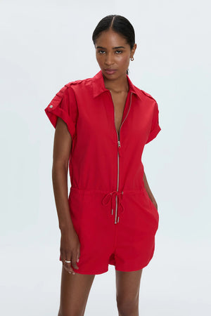 The Meg is a field suit short with a zipper front closure, epaulettes, and a drawstring at the waist for the most flattering fit every time. Wear the drawstring tied for a cinched look or have it relaxed and undone. This easy style makes the ideal vacation outfit with an airy fabric that has a touch of stretch.