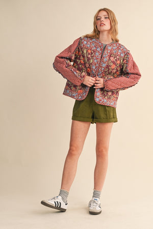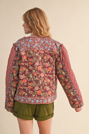 Stand out this Spring in this new quilted jacket from &Merci. With a soft burgundy base, it's classic Spring style with a smattering of delicate floral prints contrasted with a red gingham.