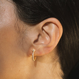 These 18kt gold plated hoop earrings shine with pavé white topaz, the stone of clarity and manifestation. Crescent moon and star accents symbolize goddess energy, protection, guidance, and dreams. Wear these earrings to inspire your journey, and to tap into your inner truth.