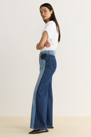 All Mixed Up is a vintage light indigo and dark indigo contrast panel jean. It features a silver shank, copper rivets, and a clean hem. Inseam: 31"
