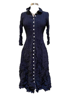 New from Alquema comes this stylish coat dress! Choose to wear modestly all buttoned up to the neck, half buttoned for a more casual look, or completely unbuttoned for a fun coat look. The soft pleating married with a collar and subtle detailing of buttons throughout creates a versatile piece, perfect for any occasion.