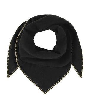 A large, cozy triangle wrap featuring blanket stitch edging, inspired by classic wool picnic blankets—a perfect layering piece for effortless style.