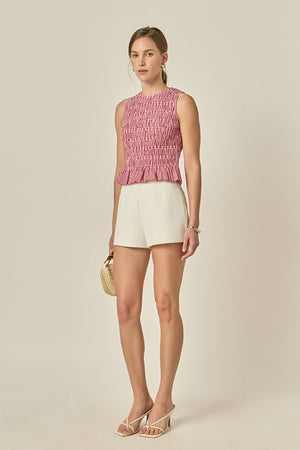 Introducing the Smocked Gingham Sleeveless Top from English Factory, a modern take on a classic print. Designed with a fully smocked bodice, this top offers a flattering, close fit with added texture and dimension. The sleeveless silhouette and clean neckline keep the look fresh, while the subtle peplum hem adds a soft, feminine shape. Easy to dress up or down, this piece pairs effortlessly with tailored shorts, trousers, or denim. A versatile addition to any wardrobe with a polished yet effortless feel.