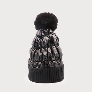 The perfect pair for the Shiny Quilted Mittens or Gloves is this hat from Caracol! Featuring a warm, ribbed rim to stay snug, it rises into a shiny quilted body and is topped with a faux fur pom