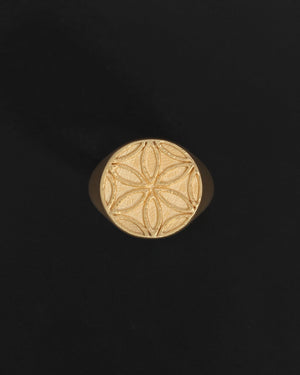 Crafted in 18k gold vermeil, the Seed of Life Seal Ring reimagines the traditional signet ring. Its circular face is debossed with a floral motif inspired by sacred geometry, adding texture and depth to the smooth polished band.