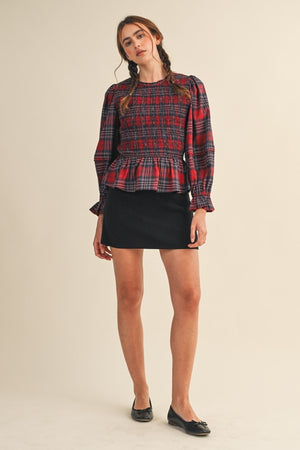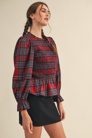 What screams holiday cheer like this new top from &Merci? This cozy blouse features a red plaid pattern with smocking on the bodice that is exaggerated by poofy sleeves and a ruffle cuff detail.