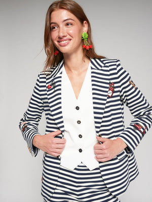 The Vilagallo Stripe Blazer showcases a delightful striped design complemented by charming positioned illustrations. Featuring a classic lapel and a single-button closure, this stylish piece includes front pockets for added convenience. Ideal for elevating casual outings or enhancing your office attire, it's a versatile addition to your wardrobe that brings character and flair to any setting.