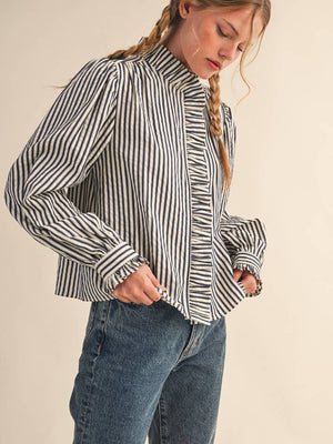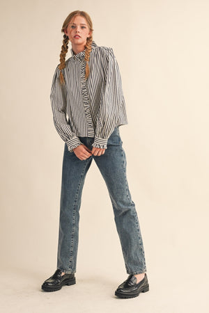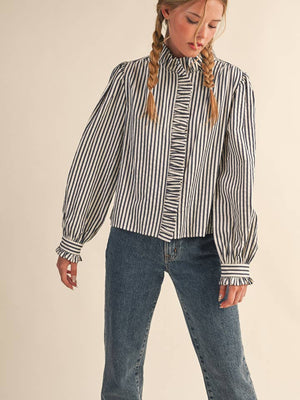 Enjoy the chic beauty of this new top from &Merci. This striking blouse features a vertical black and white stripe pattern that is elevated by a horizontal stripe ruffle detail along the collar, down the center, and at the cuffs.