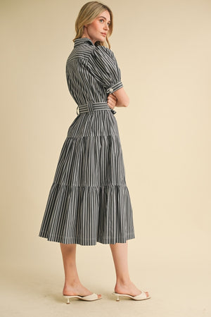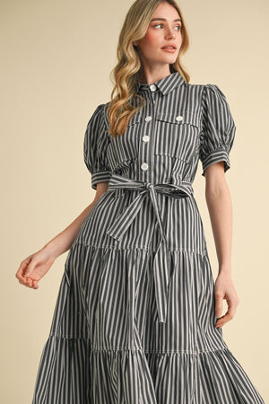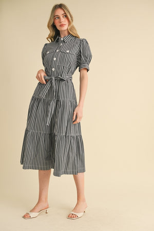 Ready for sunny days and evening strolls in this Spring-ready striped shirt dress? This striped dress features a collared neckline framed by short puff sleeves. The figure-hugging silhouette features a functional button placket to the waist that secures with a tying sash and wide belt loops. A chic tiered skirt with pockets ends at a midi hem, perfect to pair with boots or sandals!