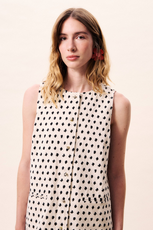 The Tamarinia Dress is a straight cut mini dress with high, round neckline and buttons through the front. Featuring a contrasting geometric pattern and front slit pockets. It's an easy one and done to pair with slides or sneakers.