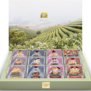 The flavors in this tea assortment box are our perennial best-sellers and include Orange, Blueberry, Acai, Strawberry, Pineapple, Cranberry, Floral Sunset (Litchi), Love Reflections (Jasmine), First Kiss (Peach), and three varieties made with rose flowers: My Growing Love, Love at First Sight, and Romeo & Juliet.