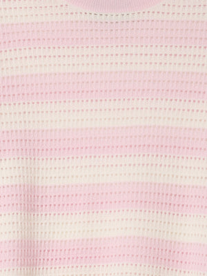 Soft fabric meets soft pink hues in this beautiful striped sweater from Jumper 1234. You'll love the feel of the open knit design which adds a breathable texture to this cozy look.