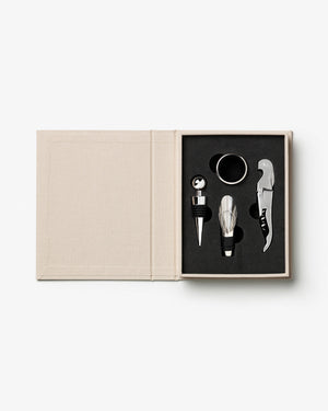 Discover the essential kit for perfecting your wine experience - a refined toolbox in an elegant book-like box that makes the perfect going-away gift. Inside, you'll find an opener, stopper, pourer, and collar, each serving as essential tools in wine appreciation. All products are made of stainless steel and are dishwasher safe.