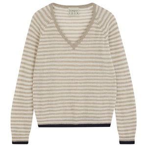This Jumper 1234 cashmere sweater is a lightweight addition to your spring sweater wardrobe. With a vee neck and stripes in a light brown and cream with contrasting navy ribs at the cuffs and hem. It's got an oversized fit to layer with all of your spring favorites.