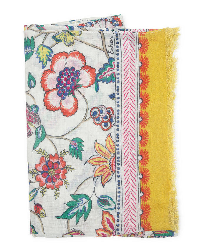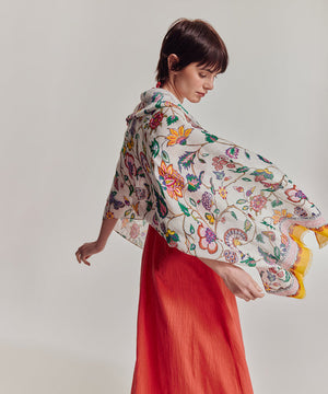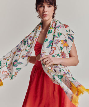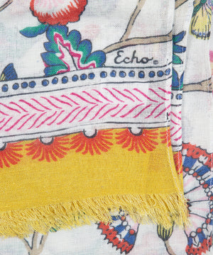 Blooms, leaves, and butterflies drifting through the foliage of a stylized tree of life design. Printed on a lightweight linen blend, this vibrant wrap adds energy and motion to any warm-weather look.