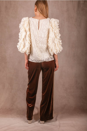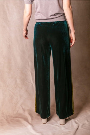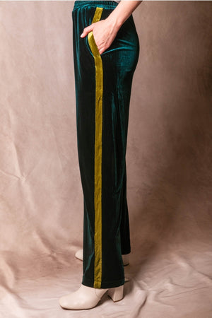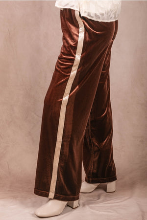 These wide leg pants feature soft velvet with contrasting side stripes for subtle sporty sophistication. Designed with an elastic waistband and relaxed silhouette, they combine comfort and style effortlessly.