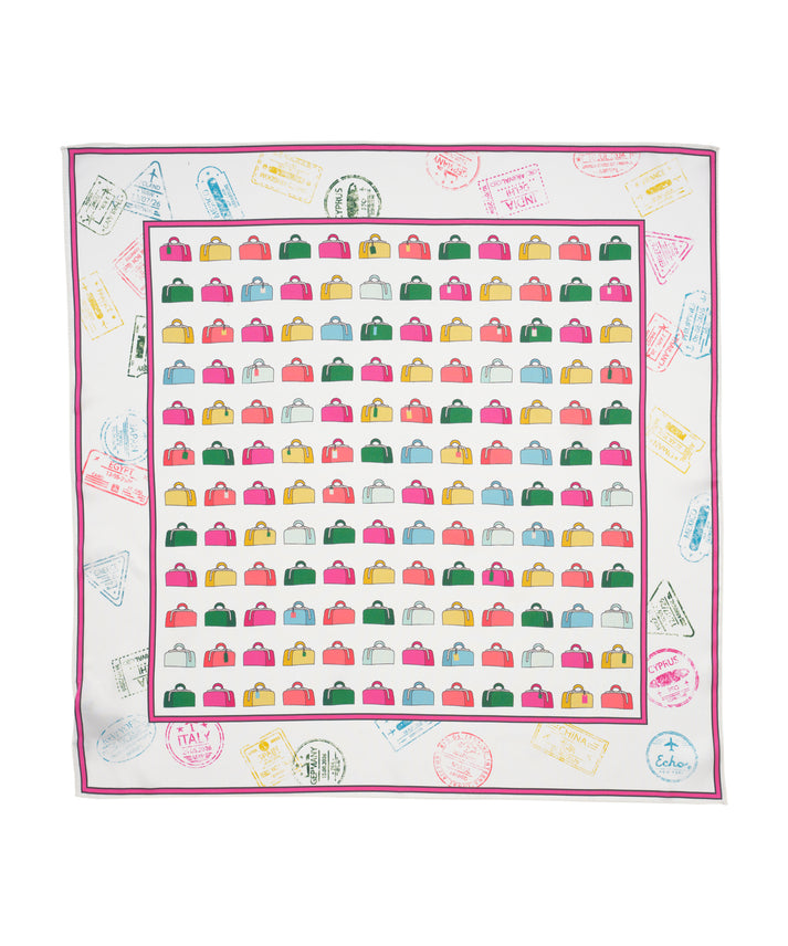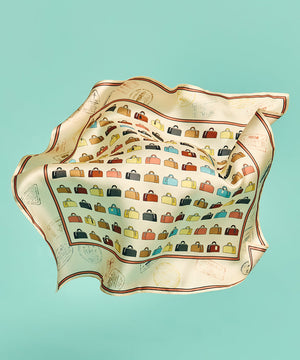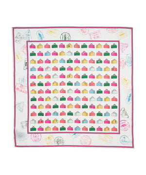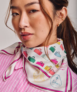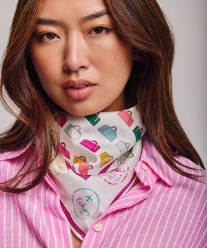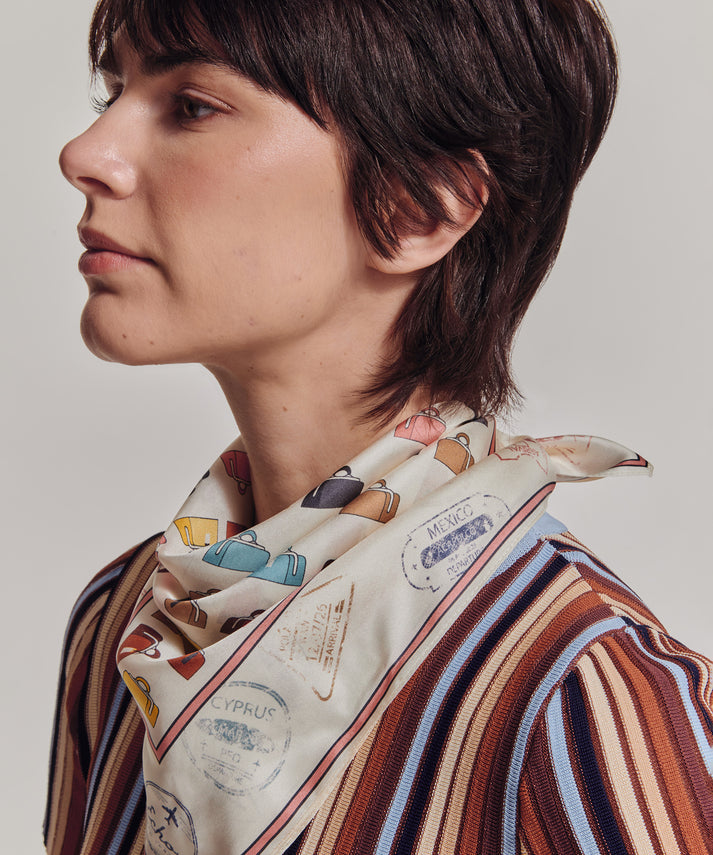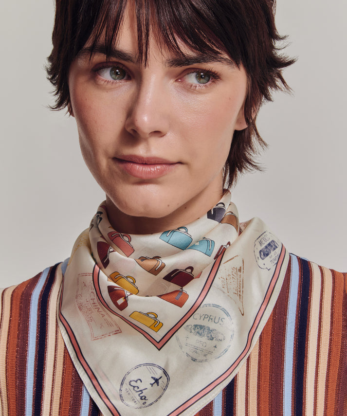 A reimagining of a vintage Echo luggage scarf, this silk bandana is framed by passport stamps collected on our travels. Worn in the hair, tied at the neck, or adding a flourish to a bag, it's the perfect companion for a lifetime of adventure.