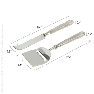 Inlaid pieces of mother of pearl on both sides of the handle of these solid stainless steel tools. The shading runs in a range from gray, to gray blue and sometimes a hint of blue-green. Thanks to mother nature’s variation, each piece will have its own special character.