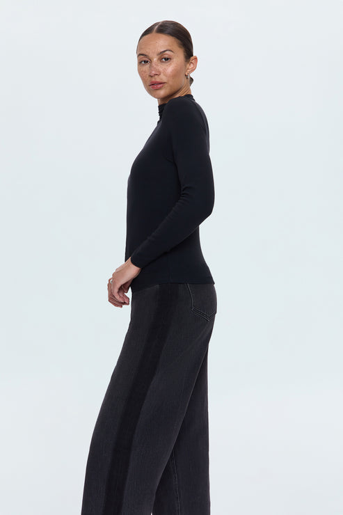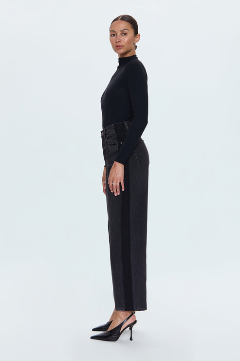 A best-selling silhouette, the Wes offers a flattering high rise and full-length 30" inseam in a stylish barrel leg that delivers sophisticated drama. Clean hems and a tuxedo stripe detail refine the shape, while premium rigid non-stretch denim in Cinema, a rich black wash, adds effortless polish and versatility.