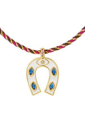 The WHITE MINI HORSESHOE necklace by MYA—BAY is gilded with 24-carat recycled fine gold . Its white enamel horseshoe pendant embodies purity, protection, and understated elegance. Measuring 39 cm + 5 cm extra chain , it is perfect alone or in a mix & match. A timeless essential, lucky charm version.